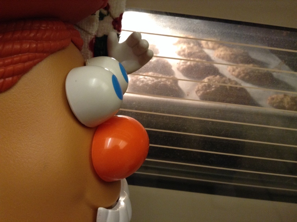 Woody and I raided the cabinet and found oatmeal cookies and raisins. Wonder if we have all the ingredient.